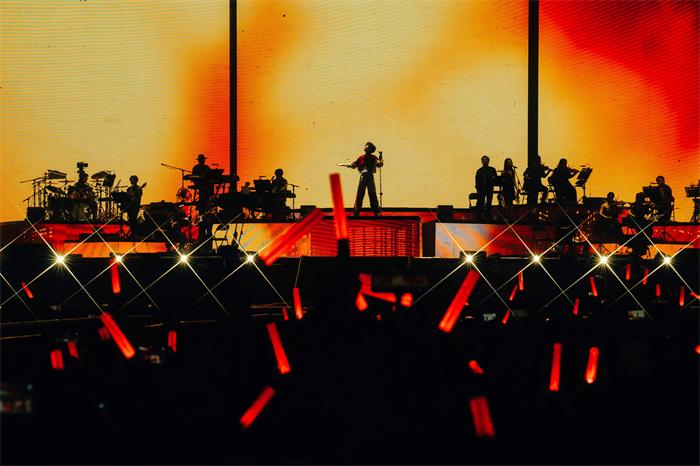 辉煌璀璨的金色灯光和背景里的一轮壮丽红日,将青岛的“橘子海”搬到了演唱会舞台。舞台的周传雄将话筒递给台下,熟悉旋律中,三万人的整齐合唱像是暮色四合,温柔包裹住了这场日落,让台上的他也忍不住泪光微闪。演出结束后,他也特地发微博纪念这个难忘的夜晚:“又看了一次海边黄昏,大家晚安。”