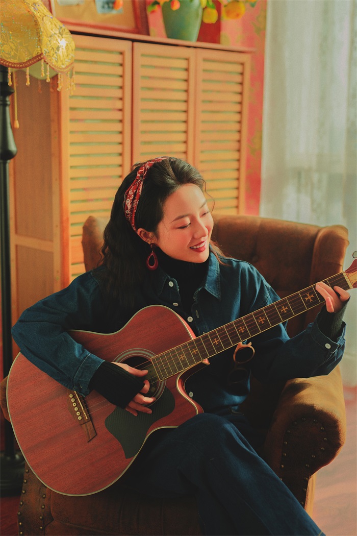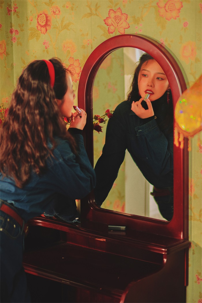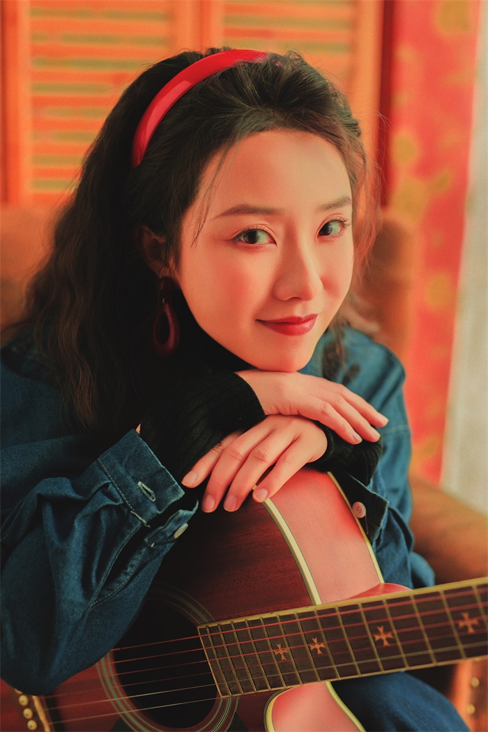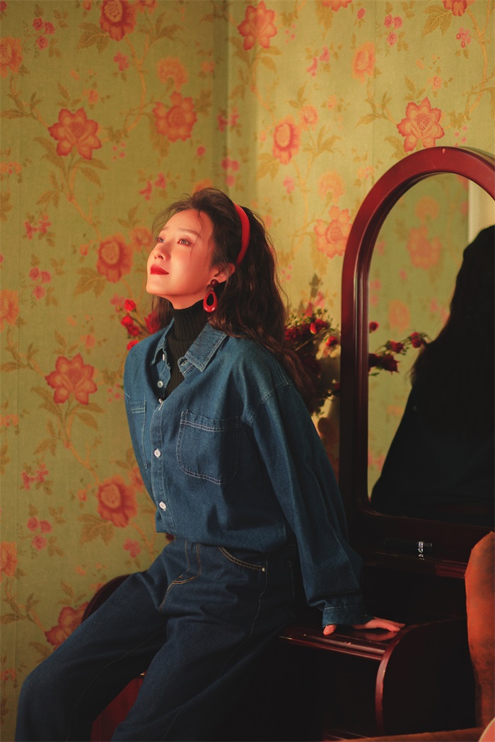 而另一组照片,崔真真则以一袭牛仔套装,搭配披肩卷发示人。复古的妆容和发箍成为点睛之笔。照片里的崔真真时而摆弄吉他,时而对镜自赏,时而凝视远方。将少女的俏皮可爱及洒脱自在活脱脱的展现在观众面前。似乎能带领每一个人进入那个充满朝气的美好时代。也仿佛将一种蓬勃的力量注入每个人的心里。