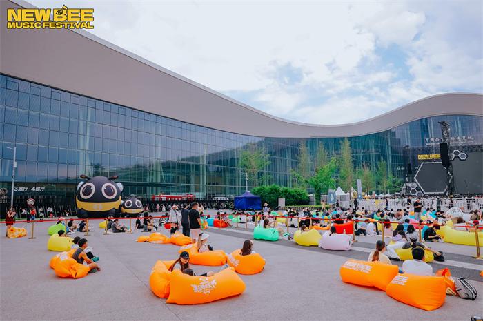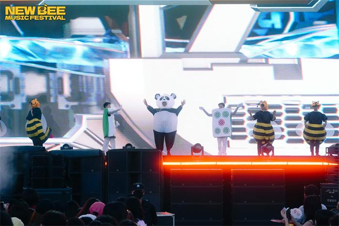 此外,本次音乐节玩法全面升级。“雨果”“埃尔”“嗡嗡”等虚拟IP“蜂格分裂”开启NewBee TV,以魔性有趣的方式为观众解读多方面安全注意事项和须知。现场设置“打工人语录”多个互动区,入场即化身“工蜂”参与剧情。随处可见的明黄色虚拟IP大型充气玩偶、重量嘉宾薛之谦主理品牌DSP的纸袋人充气玩偶,都吸引众多观众打卡。音乐节还在线发起“敢潮敢蜂”的主题穿搭活动,首创“黄黑出街”穿搭文化,鼓励观众以黑黄主题撞色造型出街。在与观众的互动环节,新蜂专属小蜜蜂、成都特色熊猫玩偶、麻将人等,不定时出没,特色大型广播体操“精神状态”引发热议,完美契合当代年轻人“发疯”文化。