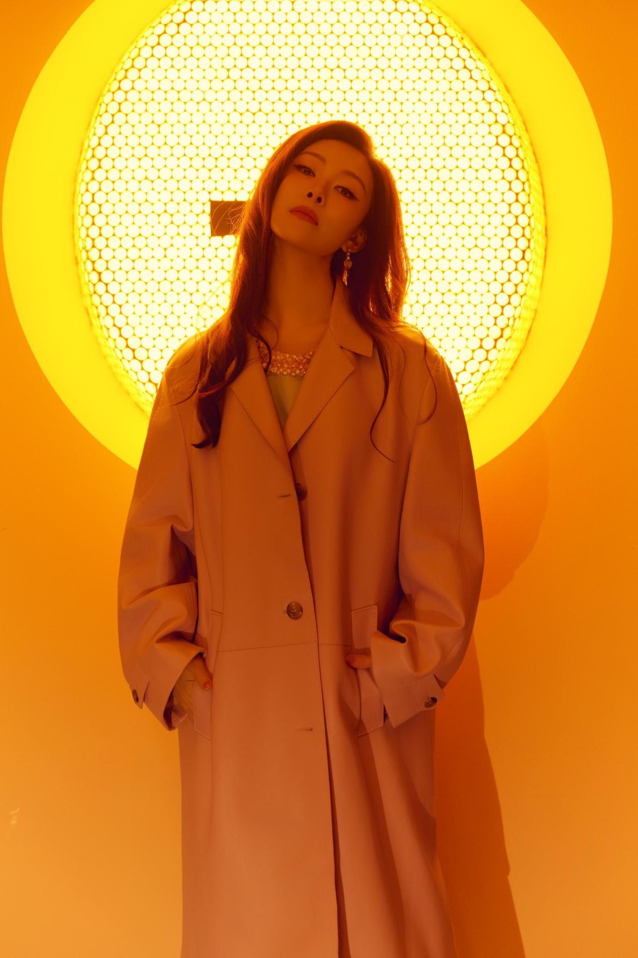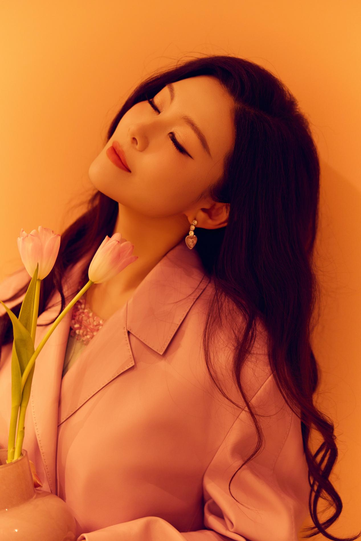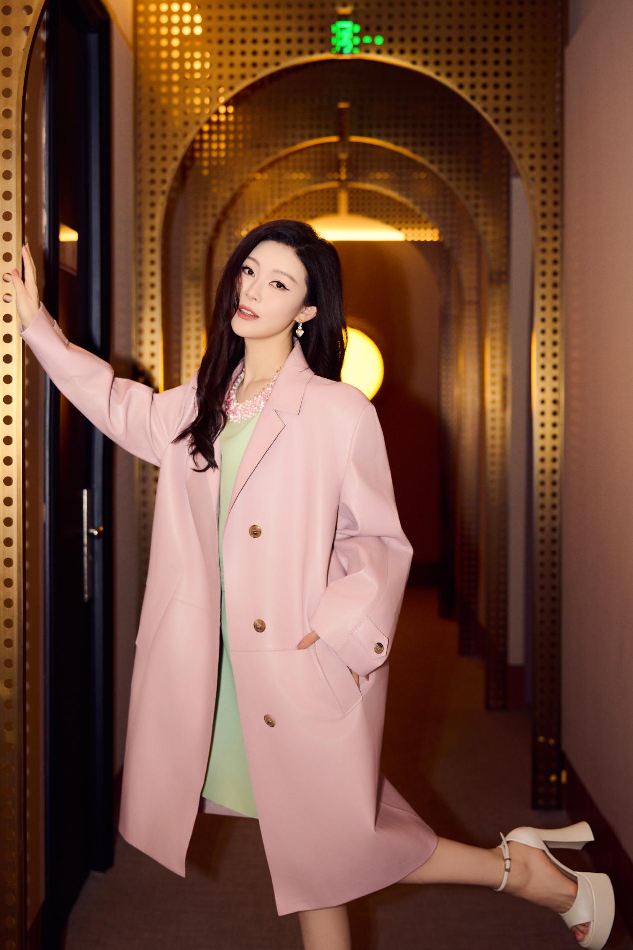 粉色大衣以利落廓形裁剪,巧妙平衡了色彩的柔与力量感的刚,演绎出“清甜怡人”的高级质感。内搭浅绿色连衣裙,领口刺绣精致入微,与外衣的柔和色调构成春日般和谐的视觉层次。脚踩白色厚底鞋,手捧粉色郁金香,常思思浅笑间尽显东方女性的温婉明媚。