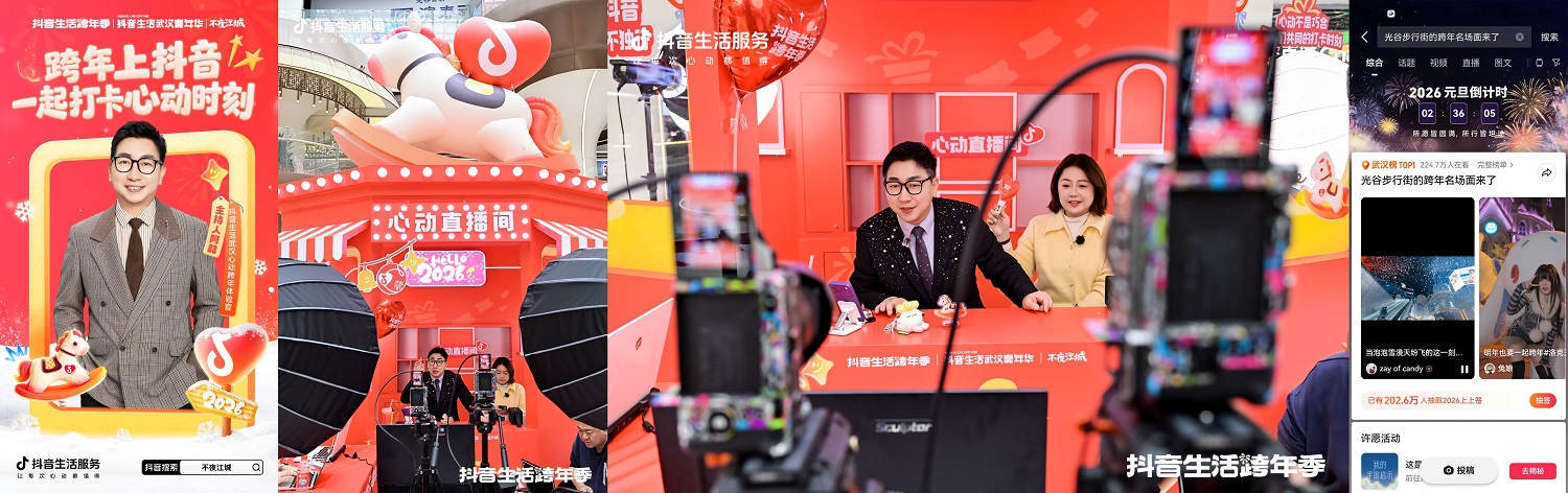 另一边的武汉光谷世界城,本地超头主持人阿喆的跨年夜直播堪称流量转化机,8万+网友在线同步狂欢,20万+的直播交易额,让线上热度成功转化为线下消费动力,抖音话题#光谷步行街的跨年名场面来了 更直接冲上武汉榜 TOP1,线上线下热度同频共振。而商圈里的多块户外大屏、地铁站超长大屏以及全楼层动态环屏,更是让“心动跨年”的氛围无处不在,走哪儿都能感受到浓浓的狂欢气息,更带动光谷商圈多个商户实现交易突破。