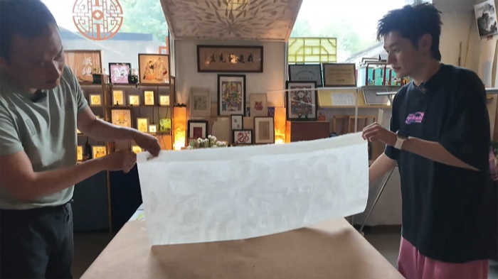 漫步在钟鼓楼附近的胡同里,青砖灰瓦间满是老北京的韵味。彭楚粤向屏幕前的观众介绍,《最美中轴线》的直播始终致力于挖掘中轴线上的文化故事,而这些故事不仅藏在宏伟的建筑里,更藏在街巷深处的寻常生活中。随后,他走进了一处隐匿在胡同中的非遗工作室,屋内满是各类纸张,从手工花草纸、宣纸等基础纸品,到纸制装饰画、灯、扇子等衍生作品,处处彰显着北京中轴线上关于纸的非遗传承与创新,空气中弥漫着传统与现代交融的独特氛围。