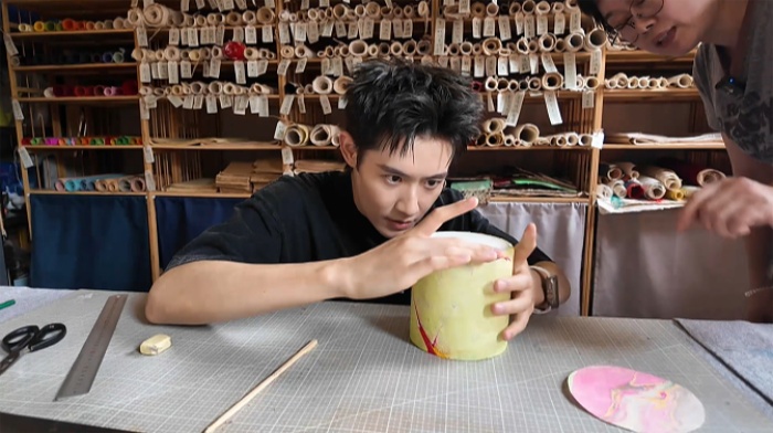 首先接触到的是墨流笺这门中轴线上的非遗技艺。这是一种以墨与水为媒的传统工艺,通过特殊的手法让墨在液体表面自然晕染、流动,形成变幻无穷的纹路,再将其巧妙转移到纸张上,最终成为独一无二的作品。制作时所用的墨材经过特别调制,质地与寻常书写之墨大不相同,正是这种独特性,让墨流笺的纹路既灵动又富有层次,每一张都带着天然的随机性与艺术感。彭楚粤在动手过程中,看着墨色在水中缓缓舒展,逐渐晕开成或疏或密的图案,深深感受到这门技艺中“天人共作”的智慧,既需人力引导,又需顺应自然,最终成就不可复制的美感。