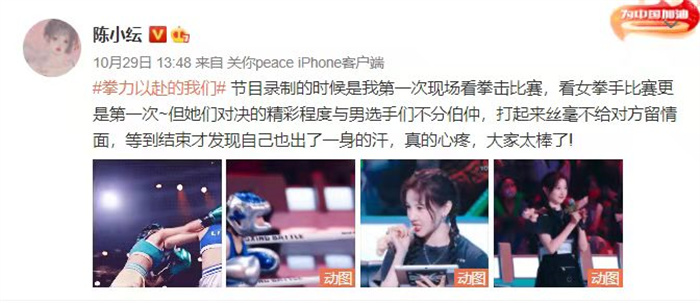 上周更新的节目中,李斯丹妮VS孙芮的对决精彩绝伦,两人站在台上丝毫不给对方留情面,双方出拳密度之高,力度之大,令网友们感叹“真是巾帼不让须眉”。陈小纭作为拳力福利官,在社交平台发文回忆自己第一次在现场观看女拳手比赛的情形,表示她们对决的精彩程度与男选手们不分伯仲,甚至结束后自己都出了一身汗。不仅选手们在“拳”力以赴地比赛,嘉宾们也在全力以赴地观战。