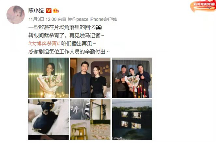 《斛珠夫人》预告片发布当日,也迎来了陈小纭出演的另一部现实主义题材作品《大博弈》正式杀青。陈小纭在社交平台上发布了杀青照及片场花絮告别角色,表达了对戏里戏外遇到的每一个人的感谢。同时,成沓的剧本、化妆间里的狗狗、洒落的花瓣……点滴细节无不记录着拍摄中的每个难忘瞬间,观众也纷纷期待着与其饰演的记者马怡尽快与大家见面。