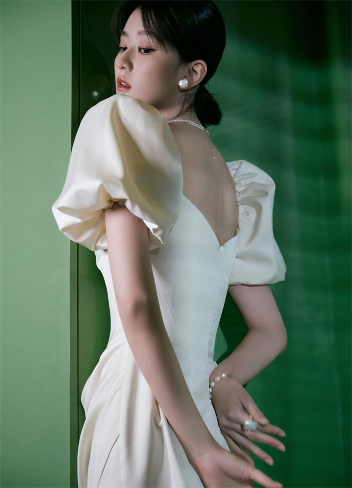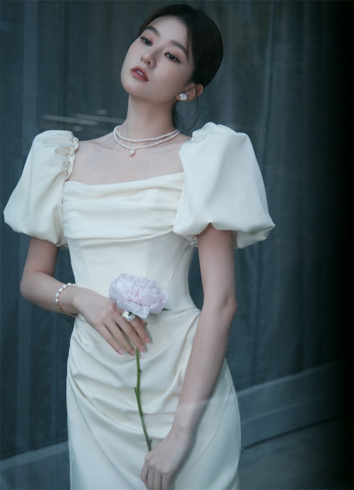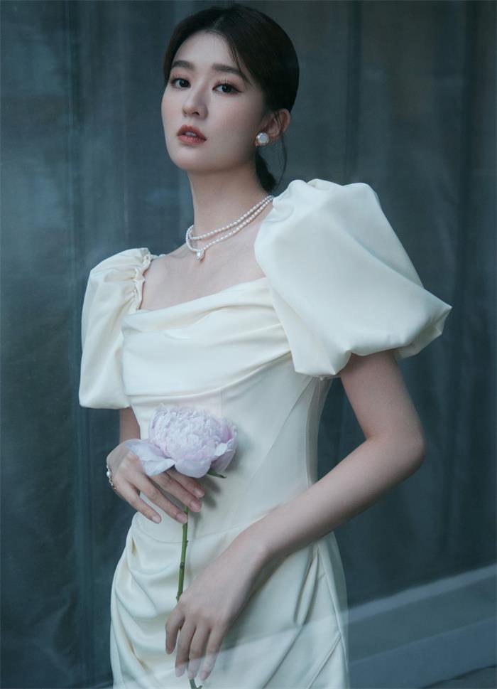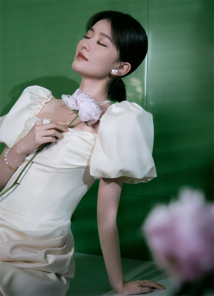 身着方领泡泡袖连衣裙,全套珍珠配饰加以点缀,小众却有设计感,造型完成度高又包含闪光点。腰肢纤细,锁骨精致,修身衣裙恰到好处地烘托出身材曲线。手持鲜花,面容姣好,一举手一投足少女感与优雅并存。