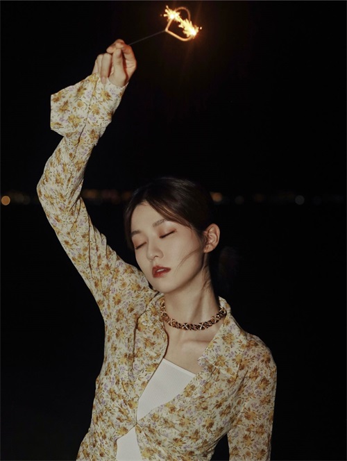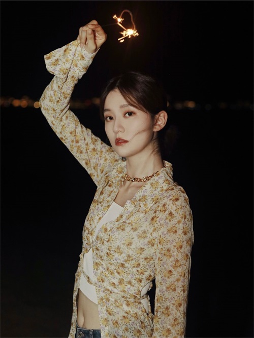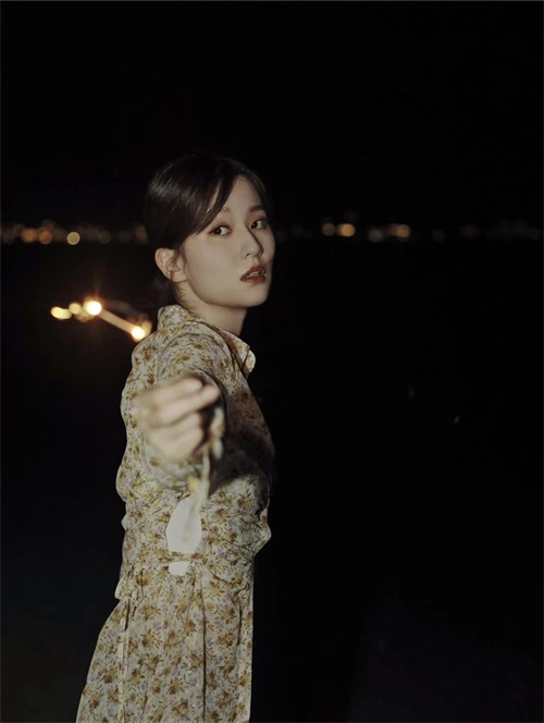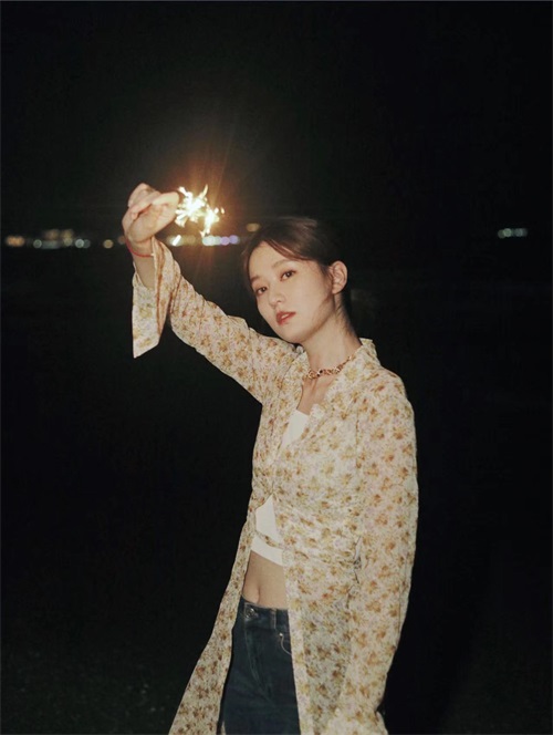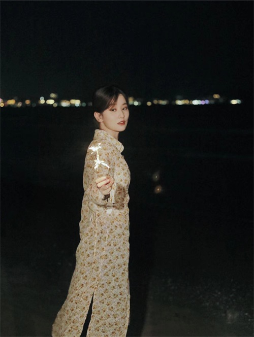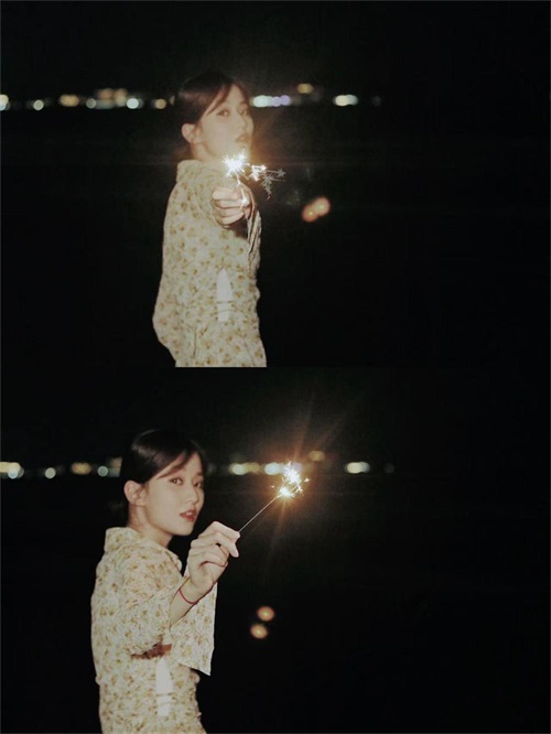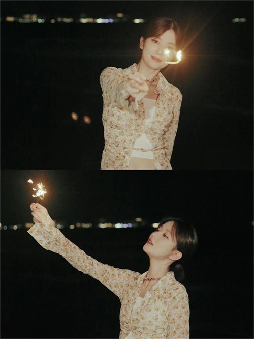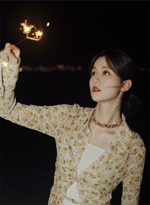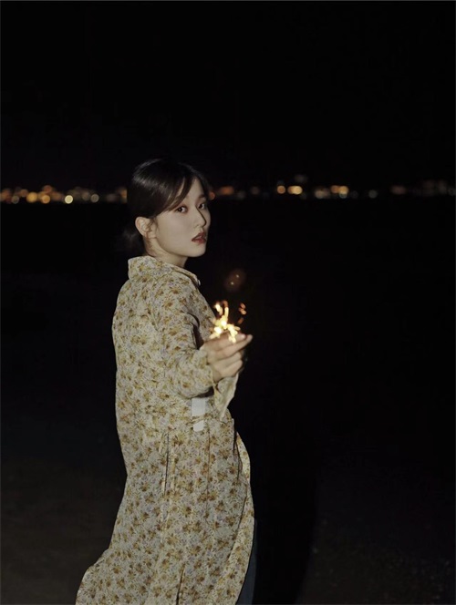乔欣在夜晚时的海边或驻足或回眸,与镜头嬉戏,手中仙女棒的烟花与远处星星点点的灯光形成呼应,意境感呼之欲出。