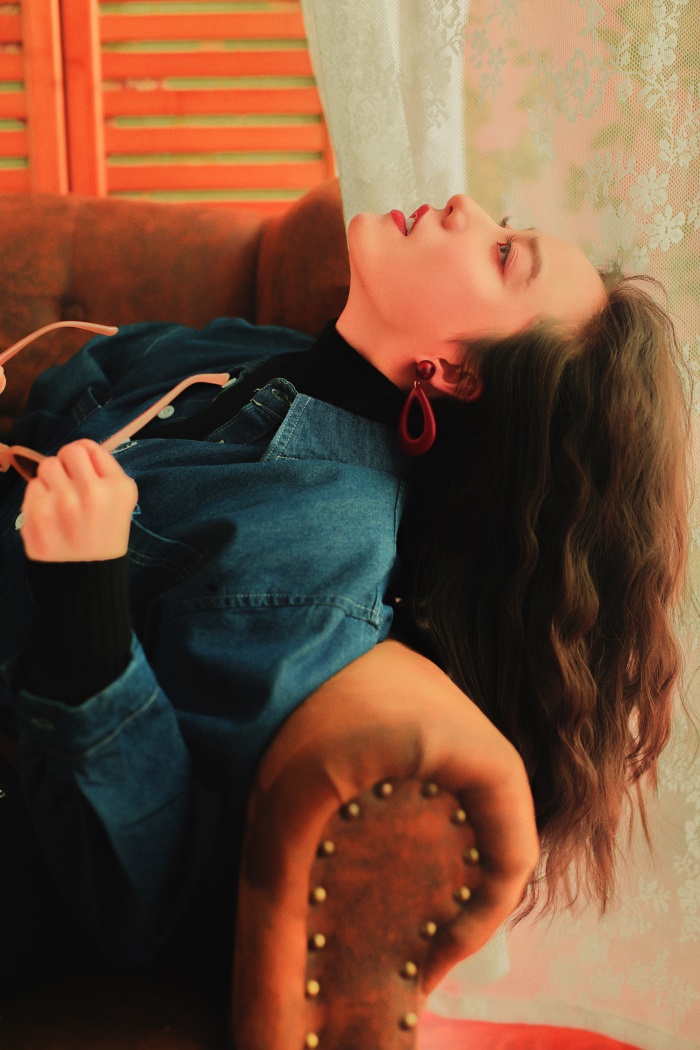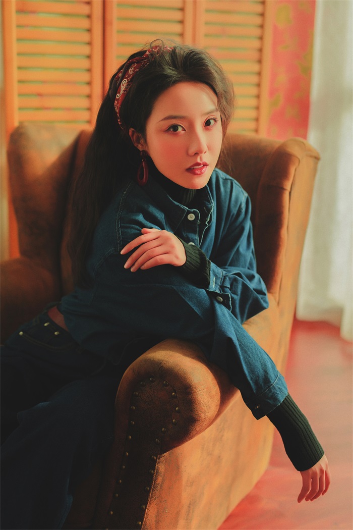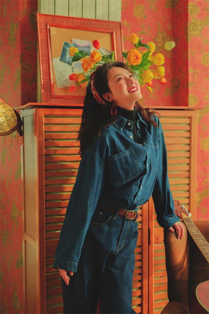 而另一组照片,崔真真则以一袭牛仔套装,搭配披肩卷发示人。复古的妆容和发箍成为点睛之笔。照片里的崔真真时而摆弄吉他,时而对镜自赏,时而凝视远方。将少女的俏皮可爱及洒脱自在活脱脱的展现在观众面前。似乎能带领每一个人进入那个充满朝气的美好时代。也仿佛将一种蓬勃的力量注入每个人的心里。
