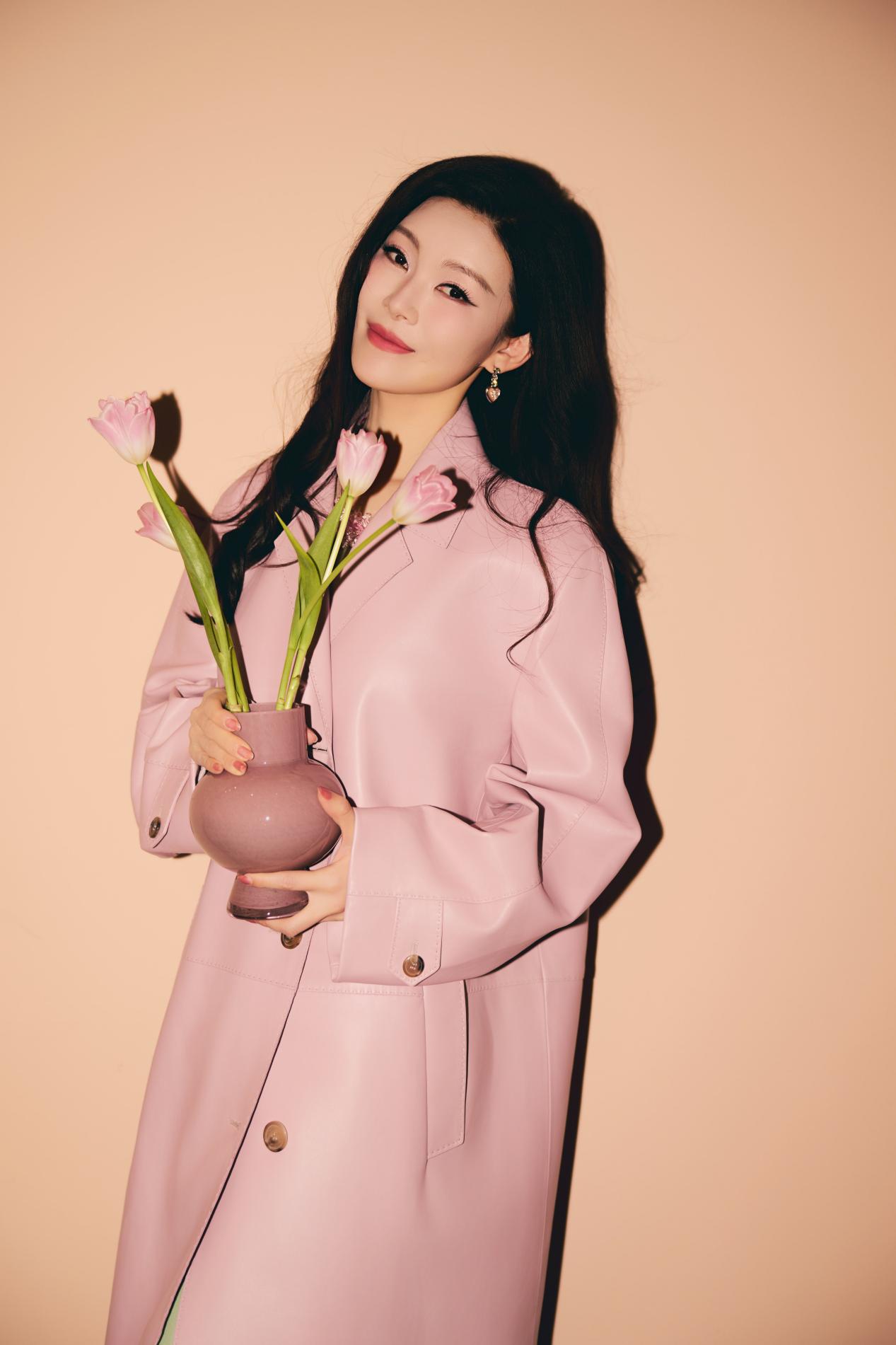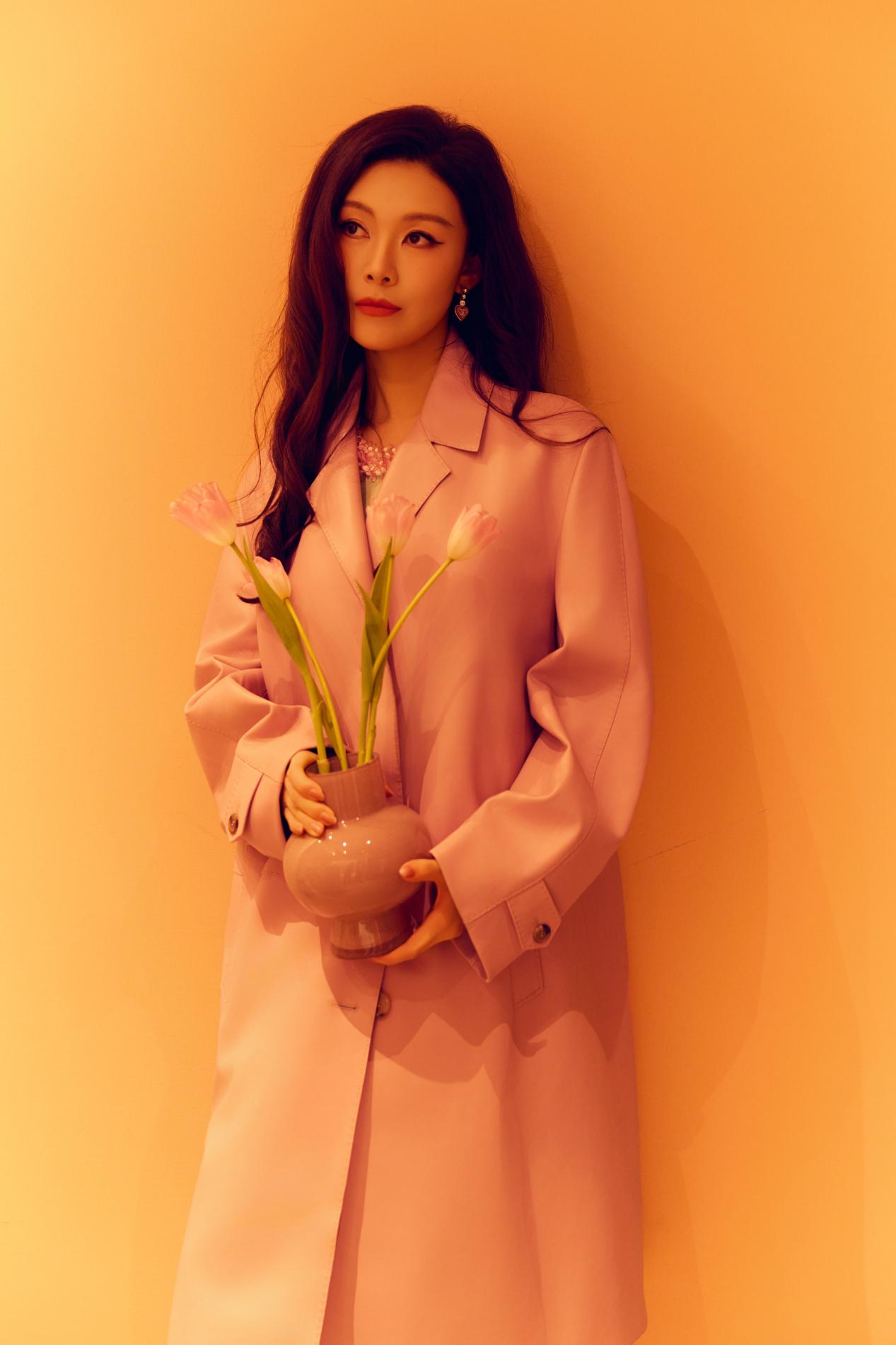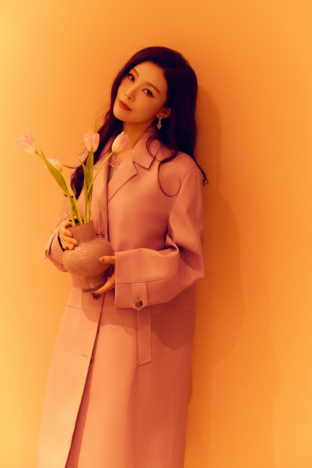 粉色大衣以利落廓形裁剪,巧妙平衡了色彩的柔与力量感的刚,演绎出“清甜怡人”的高级质感。内搭浅绿色连衣裙,领口刺绣精致入微,与外衣的柔和色调构成春日般和谐的视觉层次。脚踩白色厚底鞋,手捧粉色郁金香,常思思浅笑间尽显东方女性的温婉明媚。