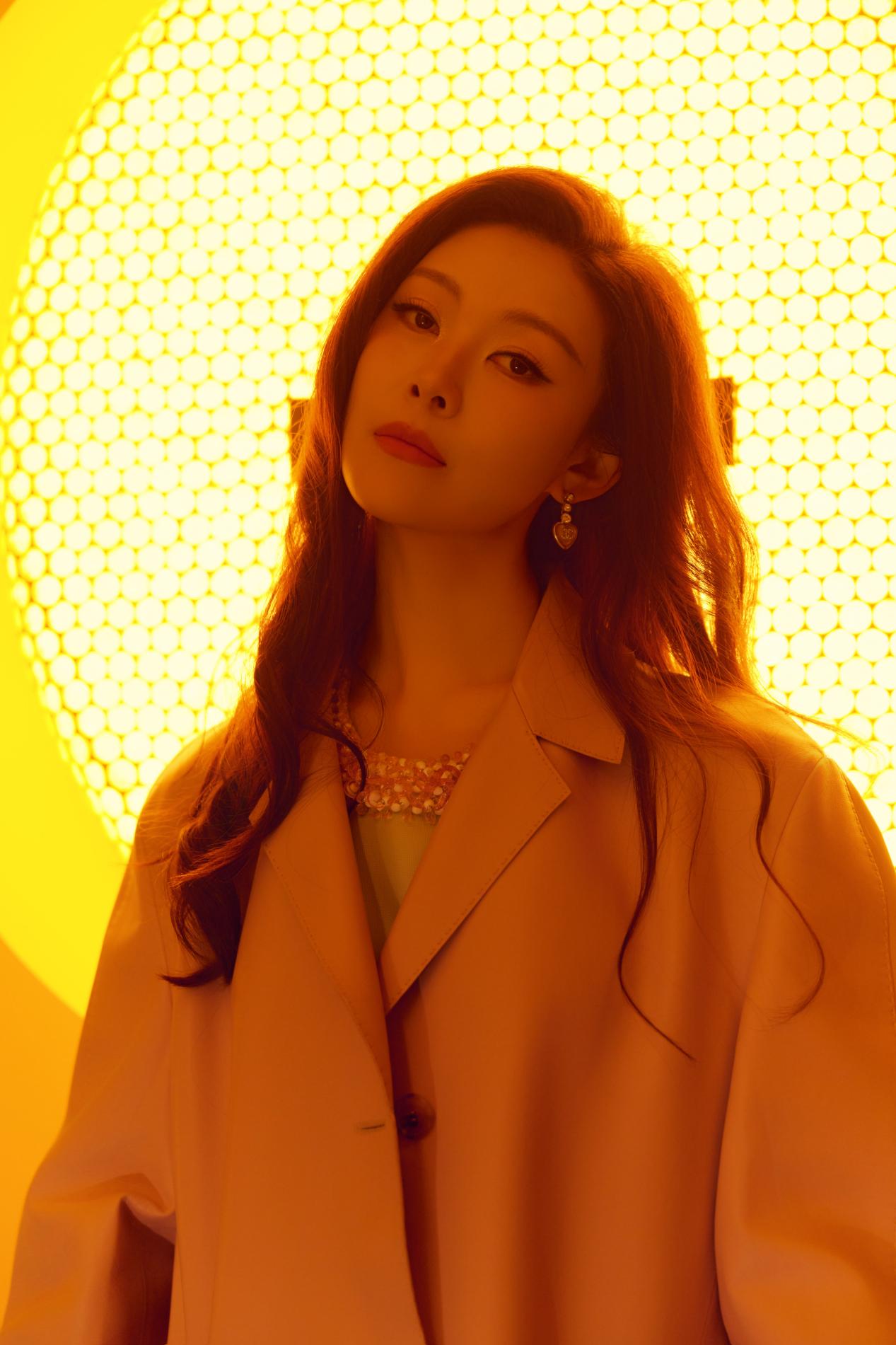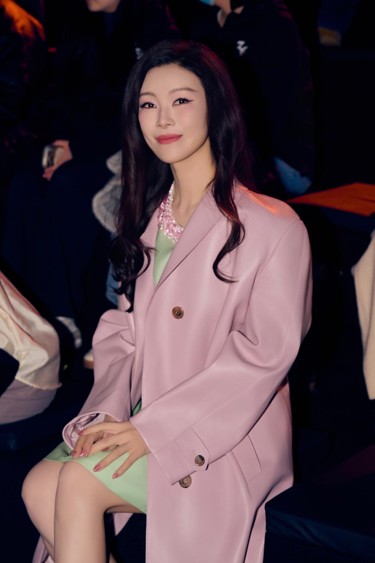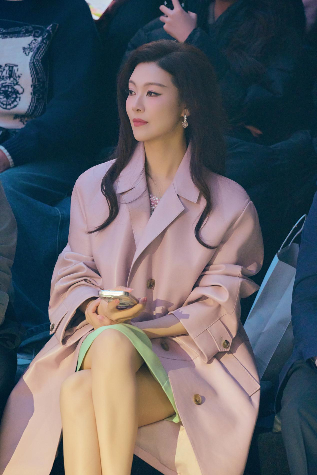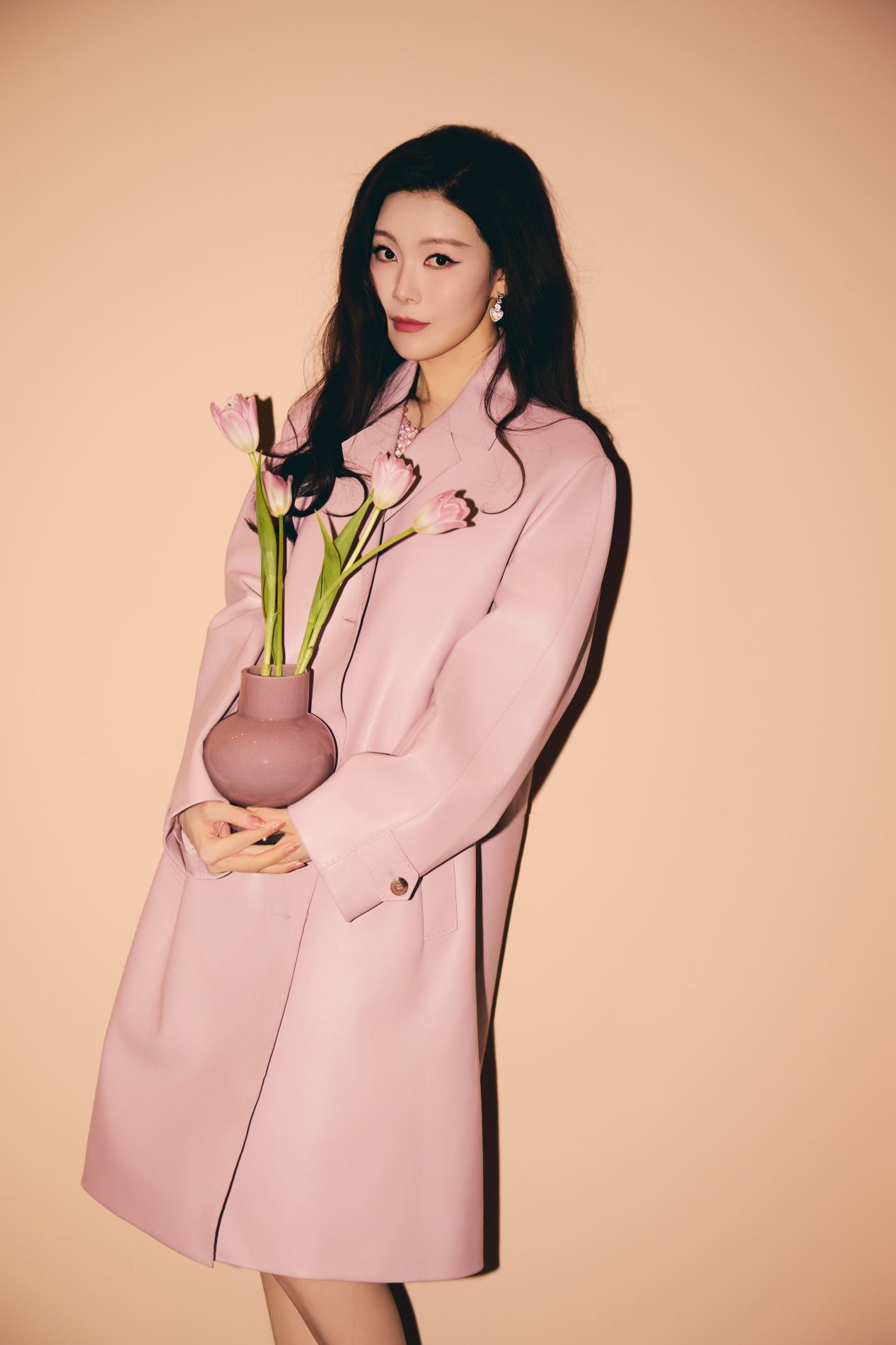 粉色大衣以利落廓形裁剪,巧妙平衡了色彩的柔与力量感的刚,演绎出“清甜怡人”的高级质感。内搭浅绿色连衣裙,领口刺绣精致入微,与外衣的柔和色调构成春日般和谐的视觉层次。脚踩白色厚底鞋,手捧粉色郁金香,常思思浅笑间尽显东方女性的温婉明媚。