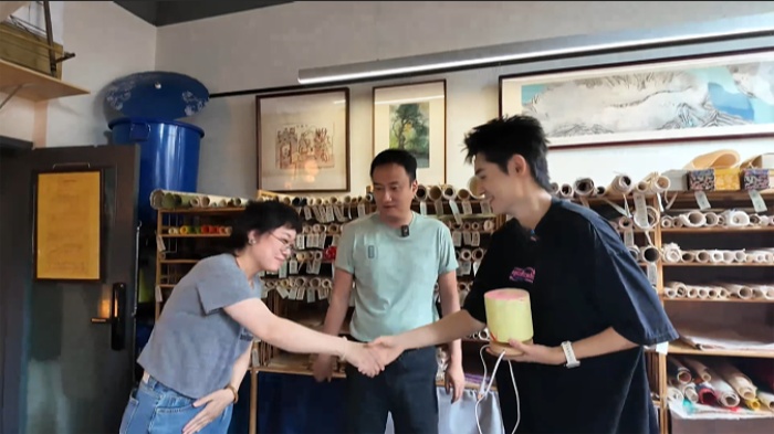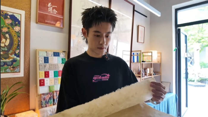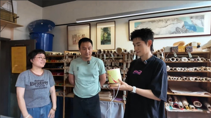 漫步在钟鼓楼附近的胡同里,青砖灰瓦间满是老北京的韵味。彭楚粤向屏幕前的观众介绍,《最美中轴线》的直播始终致力于挖掘中轴线上的文化故事,而这些故事不仅藏在宏伟的建筑里,更藏在街巷深处的寻常生活中。随后,他走进了一处隐匿在胡同中的非遗工作室,屋内满是各类纸张,从手工花草纸、宣纸等基础纸品,到纸制装饰画、灯、扇子等衍生作品,处处彰显着北京中轴线上关于纸的非遗传承与创新,空气中弥漫着传统与现代交融的独特氛围。