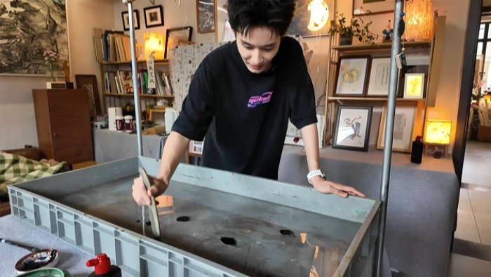 首先接触到的是墨流笺这门中轴线上的非遗技艺。这是一种以墨与水为媒的传统工艺,通过特殊的手法让墨在液体表面自然晕染、流动,形成变幻无穷的纹路,再将其巧妙转移到纸张上,最终成为独一无二的作品。制作时所用的墨材经过特别调制,质地与寻常书写之墨大不相同,正是这种独特性,让墨流笺的纹路既灵动又富有层次,每一张都带着天然的随机性与艺术感。彭楚粤在动手过程中,看着墨色在水中缓缓舒展,逐渐晕开成或疏或密的图案,深深感受到这门技艺中“天人共作”的智慧,既需人力引导,又需顺应自然,最终成就不可复制的美感。